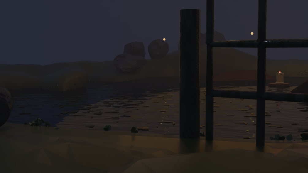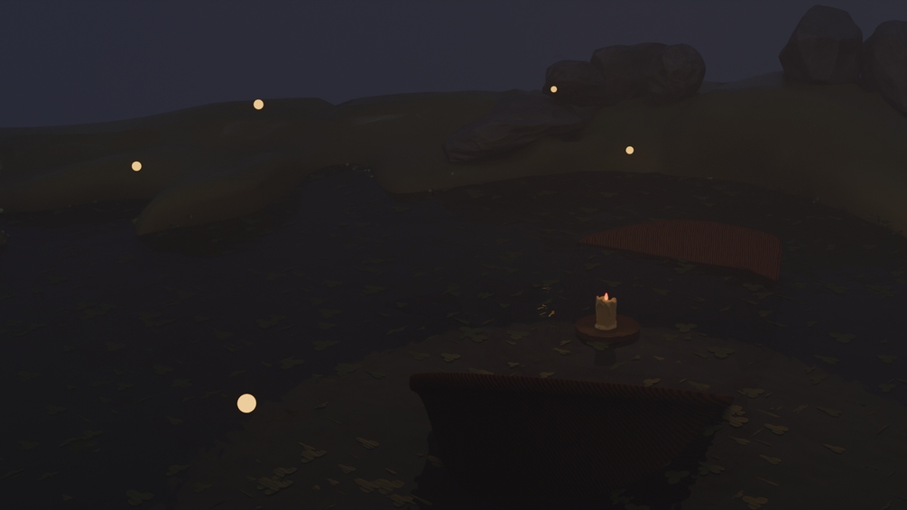 The lighting setup includes both day and night versions with fog and soft ambient tones. No HDRIs are used — just Blender’s World shader and volumetric lighting for mood enhancement.