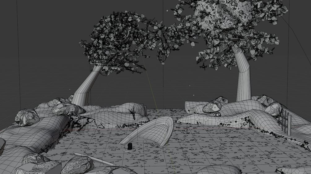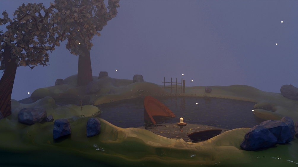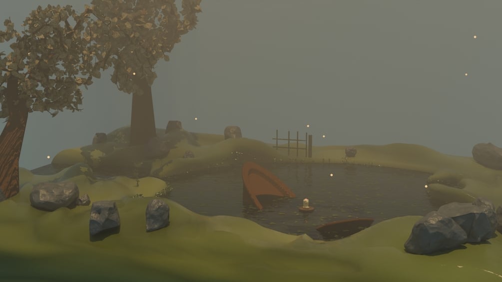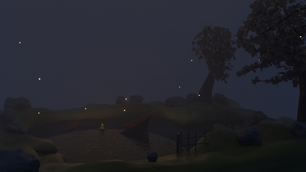 The scene consists of a stylized pond, curved boats, surrounding rocks, fireflies, a wooden fence/canes, and trees. I've included a boat that is fixed (not broken) as well in a separate collection in the file.