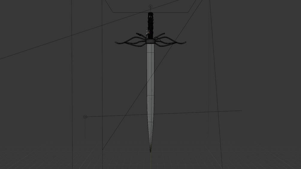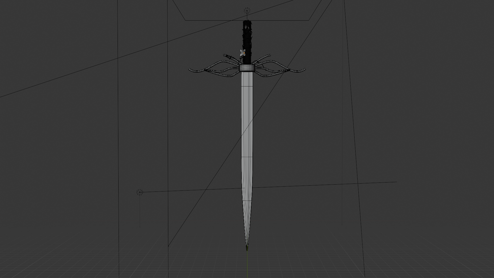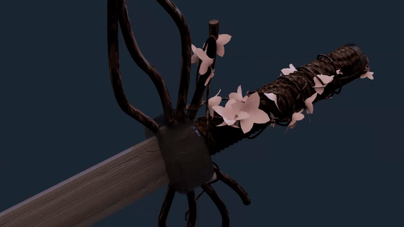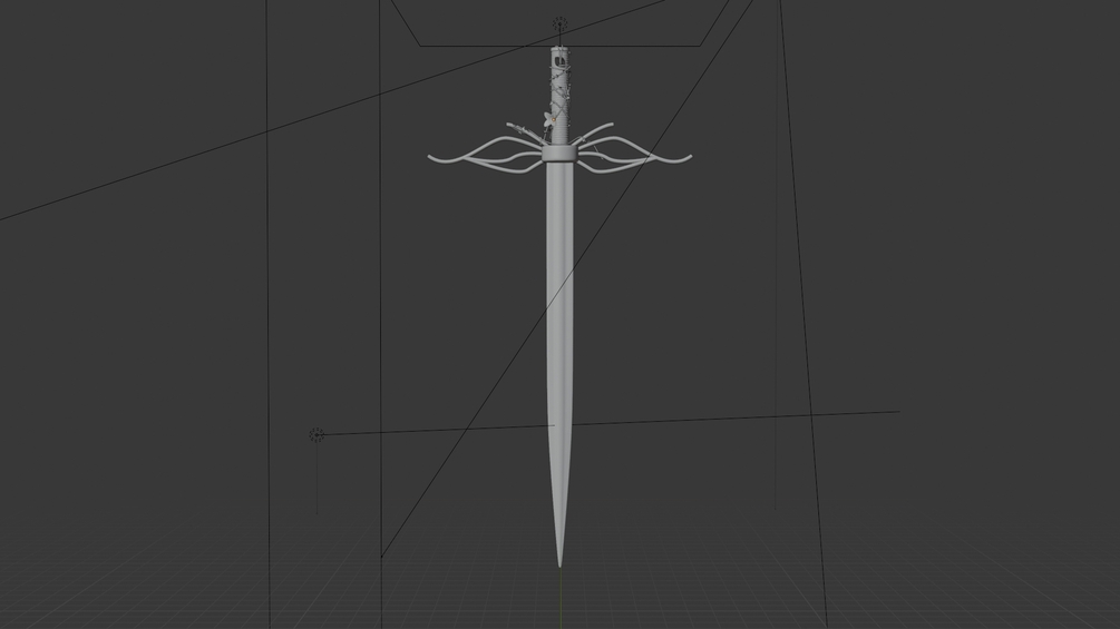 The scene consists of a sword with a long, tapering blade, a stylized twisted vine-like crossguard, and a leather-wrapped handle. The sword design is ideal for use in dark fantasy, medieval, or RPG-themed projects, either as a game asset or part of a cinematic environment.